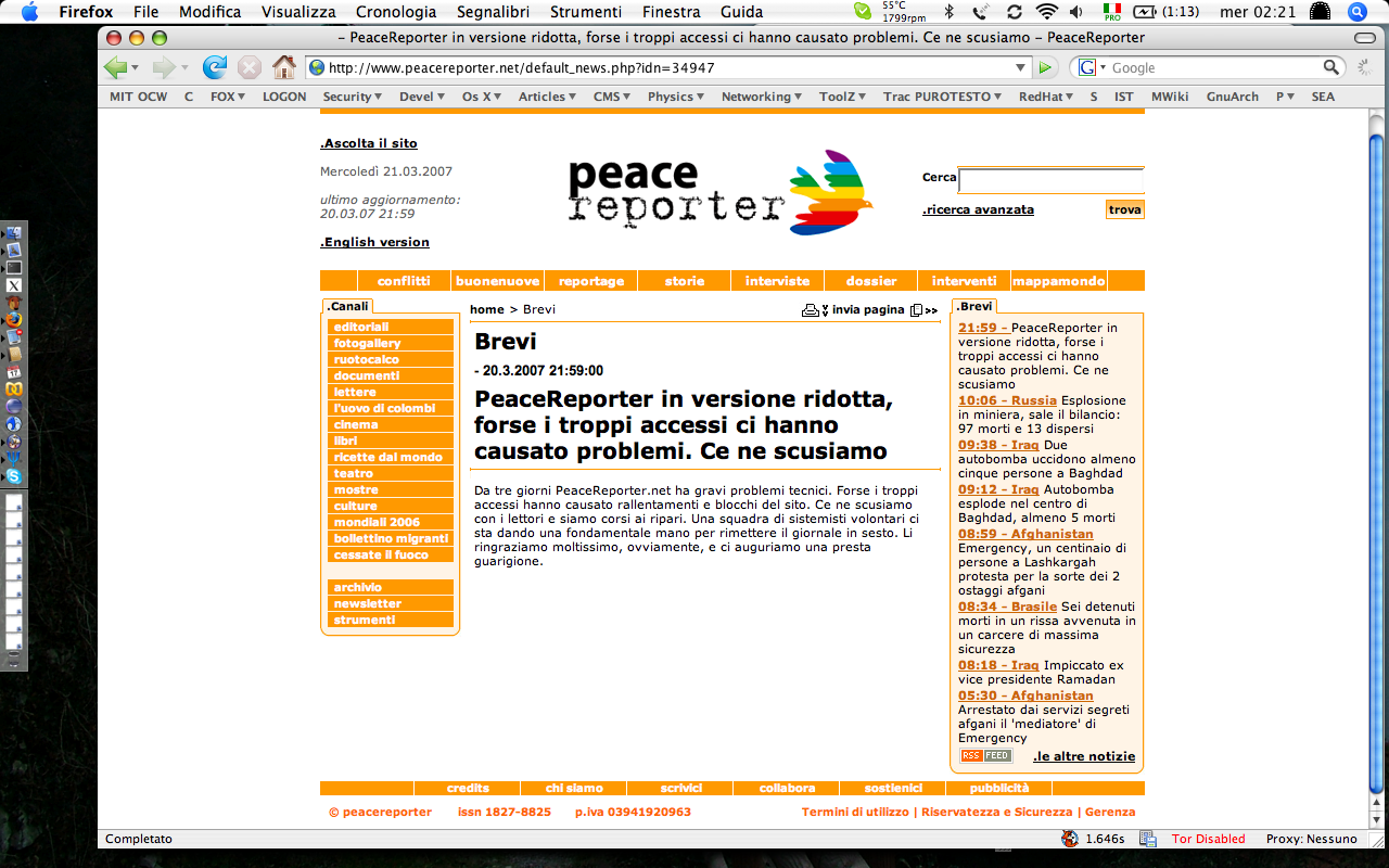 il ringraziamento a me, Fabio Invernizzi, Fabio Pietrosanti, Yvette Agostini e Simone Bruschi (e a tutto il gruppo di Sistemisti per la Pace) da parte di Stano di PeaceReporter / Emergency … non ho mai visto MySQL succhiarsi il 199% di cpu su un biprocessore… 🙂